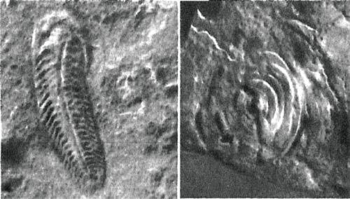 Фото 9. Два древнейших ископаемых животных, найденных в Южной Австралии. Слева: колокольчатый червь, Spriggina Floundersi, диаметром около 5 см. Справа: медузообразное животное, Cyclomedusa davidi, длиной около 2,5 см.