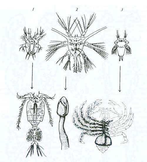 Строение личиночных форм нередко позволяет устанавливать родственные связи взрослых организмов, порой неузнаваемо различающихся. Для многих низших ракообразных характерна личинка науплиус с тремя парами конечностей и одним глазком (рис. 6.22). Взрослая форма непохожа на ракообразное, но науплиус отличается только роговидными выступами. Такие же «рожки» у науплиуса саккулины (Sacculina) (рис. 6.22, 3). Это усоногое во взрослом состоянии паразитирует в тканях высших ракообразных, прорастая в них корневидными выростами, полностью теряя облик ракообразного.