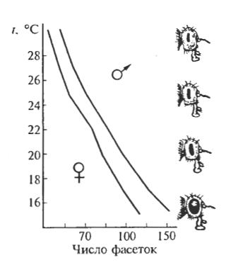 Рис. 8.4. Влияние температуры развития на проявление мутации bar у дрозофилы (по Н.В. Тимофееву-Ресовскому, 1939; из А.С. Северцова. 1980) Степень проявления (экспрессивность) мутации, вызывающей редукцию как передних, так и задних фасеток глаза, зависит от температуры окружающей среды при развитии