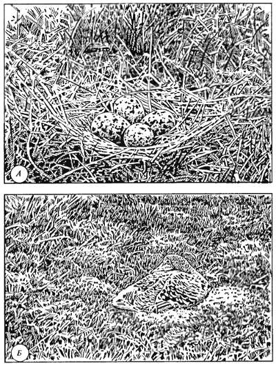Рис. 11.1. Гнездо и яйца (A. Vanellus vanellus) чибиса и гага (Б. Somateria mollisima) на гнезде (из X. Котта, 1950). Благодаря покровительственной окраске и яйца и птица малозаметны