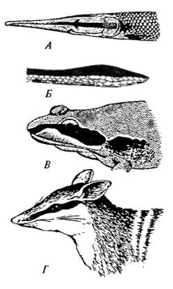 Рис. 11.3. Маскировка глаза темной полосой у некоторых позвоночных: А — рыба, Б — змея, В — лягушка, Г — сумчатый муравьед (из X. Котта, 1950)