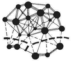 Рис. 12.1. Схема интеграции генофондов отдельных популяций в единый генофонд вида. Кружки — популяции, линии — потоки генов между ними, пунктир — возникающая изоляция частей видового генофонда (ориг. рис.)