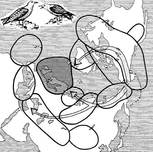 Рис. 13.3. Видообразование в группе австралийских мухоловок Pachycephala (из Э. Майра, 1968) Современное распространение показано на карте 6. Расширения и сокращения ареалов связаны с изменениями в растительности, вызванными, в свою очередь, историческими смещениями дождевых зон в разные периоды эволюции