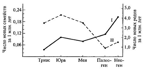 Рис. 15.11. Определение скорости эволюции по числу возникающих новых родов (I) и семейств (II) шестилучевых кораллов Scleractinia (из Д. Раупа и С. Стенли, 1974)