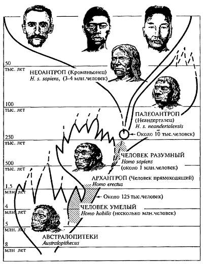 Рис. 18.3. Филогенетическое древо рода Homo и его ближайших предков. Обращает внимание типичный для всех других ветвей древа жизни пучковидный, мутовчатый характер развития отдельных ветвей, отражающий последовательно наступавшие периоды адаптивной радиации (аллогенеза) (по данным разных авторов)