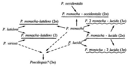 Рис. 20.3. Сетчатая эволюция в гибридогенном комплексе диплоидно-триплоидных, одно- и двуполых рыб рода Poecciliopsis. Однополые формы гибридного происхождения не подчеркнуты, диплоидные гибридогенные подчеркнуты, триплолидные гиногенетические подчеркнуты волнистой линией. В скобках указана степень полиплоидности однополых форм (по Б.В. Васильеву, 1985)