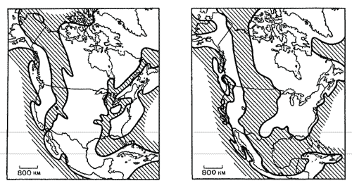 Рис. 38. Слева: обобщенная карта Северной Америки в среднедевонское время, показывающая положение морских проливов (штриховка) и суши (белая). Для сравнения тонкими линиями показаны очертания современных континентов! Справа: Северная Америка в позднемеловое время. Условные обозначения те же.