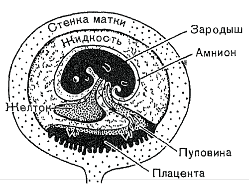 Рис. 53. Основные черты зародыша и матки у плацентарных млекопитающих (сравните с рис. 43). На ранних стадиях зародыш питается желтком, который затем исчезает. Зародыш получает питательные вещества и кислород и выделяет углекислый газ и отходы через плаценту. Направление этого обмена показано стрелками.