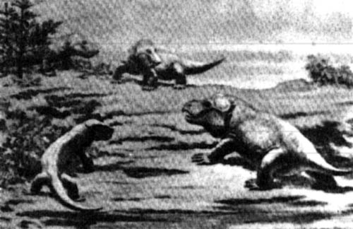 Фото 42. Два вида рептилий, подобных млекопитающим, найденные в триасовых слоях Южной Африки. Три хищника (Cynognathus, слева) готовятся напасть на травоядную рептилию (Kannemeyeria) длиной около двух метров. Растительность представлена цикадовыми и хвойными. Реконструкция.