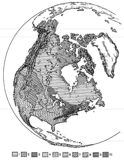 Рис. 35. Естественные растительные зоны современной Северной Америки. Обобщенно показаны типы растительности, которые занимали бы территорию, если бы там не было земледелия. Условные обозначения: 1 - арктическая тундра (злаки и травы, деревьев нет); 2 - субарктические леса (ель, пихта, сосна, береза) (Имеются, по-видимому, в виду и леса умеренного пояса. - Прим. ред.); 3 - леса северного типа (сосна, ясень, береза, тсуга) (Имеются, по-видимому, в виду и леса умеренного пояса. - Прим. ред.); 4 - горные хвойные леса; 5 - леса умеренного пояса (дуб, гикори, сосна и др.); 6 - прерия и саванна (степь с отдельными деревьями); 7 - сухие равнины с травянистой растительностью; 8 - пустынные кустарники и злаки; 9 - субтропические кустарники; 10 - сухие редколесья тропического типа.