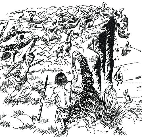 Другую позицию занимают ученые, считающие, что такая массовая гибель могла быть вызвана только каким-то новым фактором, не существовавшим в более ранние эпохи. Они предполагают, что этим фактором могло быть появление в Америке человека. У него были стрелы с режущими краями и острыми наконечниками из кварца. Он использовал метательные орудия, чтобы метать стрелы с большей скоростью. Он мог убивать и другими способами, например сооружая ловушки или загоняя животное в болото или озеро, или гоня стадо животных к обрыву (часто с помощью огня), так что они падали с обрыва и разбивались (рис. 71).
