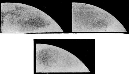 Когда вы впервые видите Венеру в небольшой телескоп, она кажется ярким и совершенно чистым диском. Однако, если наблюдать очень внимательно, на нем часто можно разглядеть темные пятна; мы приводим типичные примеры рисунков, сделанных членами секции Меркурия и Венеры Британской астрономической ассоциации (рис. II). На большинстве этих рисунков тени умышленно сгущены, иначе их вообще нельзя было бы воспроизвести.