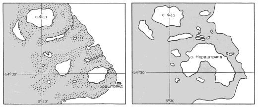 Рис. 25. Рисунок наглядно показывает, как единичный штормовой прилив может изменить всю морфологию побережья. Слева: Северо-Фризские острова до мощного прилива 1634 года, справа – после него. Точками обозначены песчаные отмели. (По Г. Загеру, 1959)