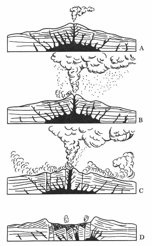 Рис. 27. Схематическое изображение образования кальдеры. На стадиях А и В происходит выброс пепла и излияние лав. На стадии С возникают вертикальные кольцеобразные трещины, по периметру которых весь конус обрушивается в образовавшиеся подземные пустоты