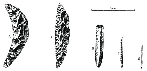 Рис. 79. Образцы орудий кроманьонцев. Специализированные орудия, изготовленные из кварца с помощью отжимной техники (А - В), и орудия из кости и бивня мамонта, обработанные резанием и шлифованием (Г, Д). Представлены: «серп», «пила», нож, наконечник гарпуна и игла с ушком.