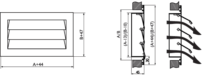 Решетки оснащены легко вращающимися алюминиевыми жалюзи, установленными в раму. Жалюзи установлены таким образом, что при отключении вентилятора они закрываются под действием силы тяжести. Решетки должны устанавливаться только вертикально, лопастями вниз. Монтаж в воздуховодах обеспечивается с помощью самонарезающих винтов.