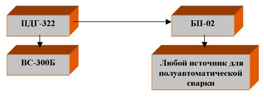 ПДГ-322 подающий механизм закрытого типа. Внутри установлен 2-х роликовый редукторный привод CWF 3110, кассета для сварочной проволоки, тормозное устройство, плата управления и электромагнитный клапан. На лицевой панели механизма имеются резисторы регулировки длительности режима сварки электродуговыми точками, продувки защитного газа и регулировки скорости подачи сварочной проволоки.