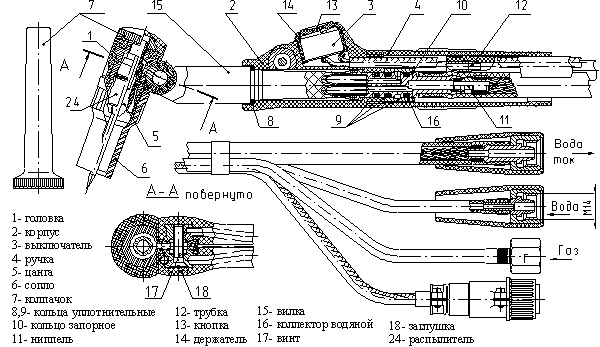 АГНИ-12М - горелка предназначенная для ручной сварки не плавящимся электродом малоуглеродистых и нержавеющих сталей, сплавов меди, никеля, титана на постоянном токе прямой полярности, а так же алюминия и его сплавов на переменном токе. Горелка АГНИ-12М не имеет водяного охлаждения, поэтому ее применение особенно удобно, когда возникают трудности с использованием охлаждающей воды - на монтаже, на большой высоте, при отрицательных температурах, в условиях небольших производств и мастерских. Конструкция горелки позволяет поворачивать головку относительно продольной оси рукоятки на ± 180о в удобное для работы положение и обеспечивает хорошую защиту рукоятки от перегрева. Горелка имеет кнопку дистанционного управления сварочным током. Подвод защитного газа (аргона) и сварочного тока осуществляется раздельно.