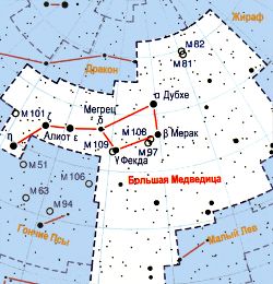 Большая Медведица — созвездие северного полушария неба, ее семь звёзд составляют самую известную на небе фигуру. Это ковш, который двумя своими крайними звездами Дубхе (α Большой Медведицы, 1,8m) и Мерак (β Большой Медведицы, 2,3m) дает направление на Полярную звезду.