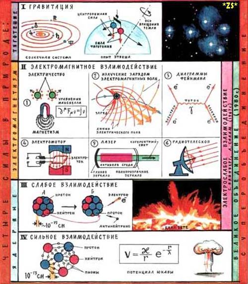 | Проявление | ядерные силы, обеспечивающие существование ядер | кулоновская сила, обеспечивающая состояние атома | β-распад | всемирное тяготение, обеспечивающее существование звезд, планетных систем |