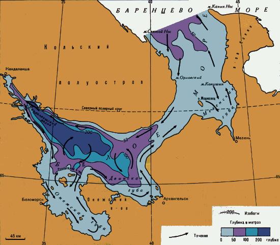 Так как речной сток сосредоточивается главным образом в вершинах заливов, здесь возникает сточное течение, направленное в открытую часть Бассейна. Под влиянием силы Кориолиса движущиеся воды прижимаются к правому берегу и из Двинского залива уходят вдоль Зимнего берега в Горло. У Кольского берега проходит течение из Горла в Кандалакшский залив, далее вдоль Карельского берега в Онежский залив и вытекает из него у его правого берега. Перед выходом из заливов в Бассейне создаются слабые циклонические круговороты между движущимися в противоположных направлениях водами. Эти круговороты вызывают антициклоническое движение вод между ними. Вокруг Соловецких островов прослеживается движение вод по часовой стрелке. Скорости поверхностных течений невелики и обычно равны 10—15 см/с, в узкостях и у мысов они достигают 30— 40 см/с. Гораздо большие скорости в некоторых районах имеют приливные течения. В Горле и Мезенском заливе они достигают 250 см/с, в Кандалакшском — 30—35 и Онежском заливе — 80—100 см/с. В Бассейне скорость приливных течений меньше, чем в заливах.