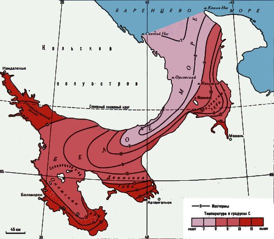 Следовательно, за год возобновляется более 2/3 всей массы глубинной (ниже 50 м) беломорской воды. На выходе из Двинского залива холодные глубинные слои значительно ближе расположены к поверхности, чем в других районах Бассейна. Температура 0° наблюдается здесь всего в 12—15 м от поверхности. Этот район К. М. Дерюгин (1928) назвал «полюсом холода». Его формирование объясняется циклонической циркуляцией поверхностных вод, в центре которой происходит подъем глубинной воды. Очень ярко «полюс холода» выражен летом. В осенне-зимнее время с развитием вертикальной циркуляции он заметен слабее. При выходе из Кандалакшского залива картина обратная: теплые воды опускаются глубоко вниз. Нулевая температура наблюдается на горизонте 65 м, тогда как в других местах на этом горизонте температура обычно отрицательная. К.М. Дерюгин назвал эту область «полюсом тепла». Его существование связано с влиянием притока однородных и более теплых по сравнению с окружающими глубинных вод из Горла. Это подтверждается увеличением толщины поверхностных теплых вод в области «полюса тепла» осенью, когда приток глубинных вод из Горла становится интенсивнее.