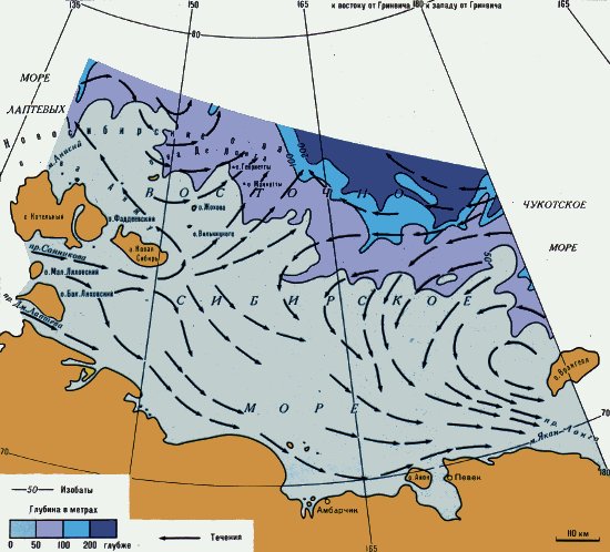 Восточно-Сибирское море — самое ледовитое из морей Советской Арктики. С октября—ноября по июнь—июль оно полностью покрыто льдом. В это время преобладает принос льдов из Арктического бассейна в море в отличие от других морей Арктики, где превалирует выносной дрейф льда. Характерная особенность льдов Восточно-Сибирского моря — значительное развитие припая зимой. При этом он наиболее широко распространяется в западной, мелководной части моря и занимает узкую прибрежную полосу на востоке моря. На западе моря ширина припая достигает 400—500 км. Здесь он соединяется с припаем моря Лаптевых. В центральных районах его ширина 250—300 км и к востоку от м. Шелагского — 30— 40 км. Граница припая приблизительно совпадает с изобатой 25 км, которая проходит в 50 км к северу от Новосибирских островов, затем поворачивает на юго-восток, приближаясь к побережью материка у м. Шелагского. К концу зимы толщина припая достигает 2 м. С запада на восток толщина припая уменьшается. За припаем располагаются дрейфующие льды. Обычно это однолетний и двулетний лед толщиной 2—3 м. На самом севере моря встречается многолетний арктический лед. Преобладающие зимой ветры южных румбов часто относят дрейфующие льды от северной кромки припая. В результате этого появляются значительные пространства чистой воды и молодых льдов, образующие на западе Новосибирскую и на востоке Заврангелевскую стационарные заприпайные полыньи.