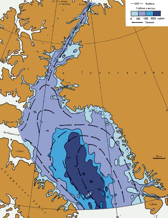 Положение моря Баффина в высоких арктических широтах, его ограниченная связь с Северным Ледовитым и свободное сообщение с Атлантическим океанами в основном определяют его гидрологические условия.