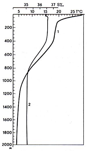 Ниже «восемнадцатиградусной воды», в слое от 500 до 1000—1200 м, расположен главный термоклин, в котором температура воды понижается от 17—18 до 6°.