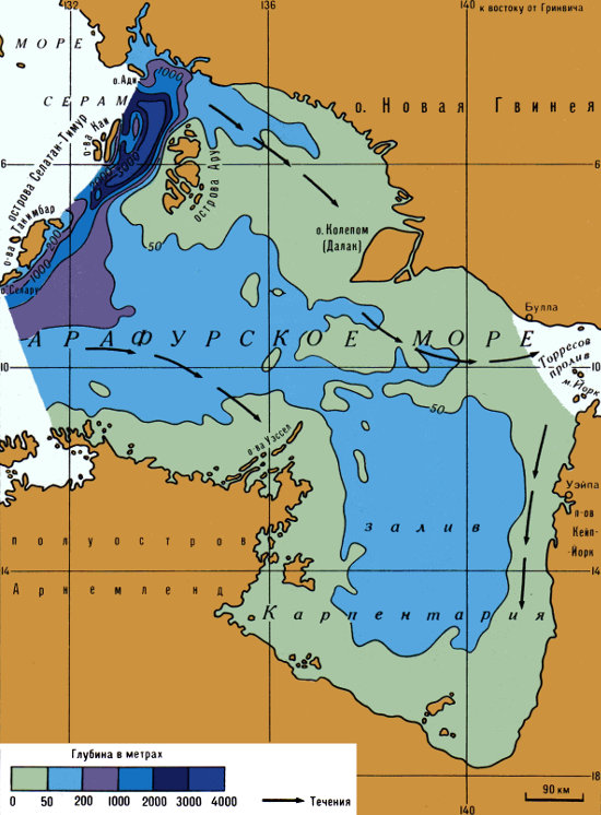 Распределение температуры воды на поверхности моря неодинаково во время осенне-зимнего и весенне-летнего муссонов. При северо-западном муссоне поверхностные воды прогреваются наиболее сильно. На открытых пространствах моря их среднемесячная температура в январе — феврале достигает 20— 28,5°. В заливе Карпентария она близка к 29,5°, а в прибрежных районах, особенно в защищенных заливах и бухтах, повышается до 30—30,5° и даже чуть выше. На преобладающей части пространства моря с глубинами до 50—60 м значения температуры, близкие к поверхностным, сохраняются до горизонтов 35—40 м, глубже она понижается и равна примерно 26—27°. В глубоких районах моря температура воды резко понижается до горизонтов 100—150 м, где она равна 19—21°, затем понижается более плавно и на горизонтах 250—300 м равна 10—12°, далее медленно понижается до 4,5—5° на горизонтах 1000— 1250 м и на самых больших глубинах моря равна 3,7—3,9°.