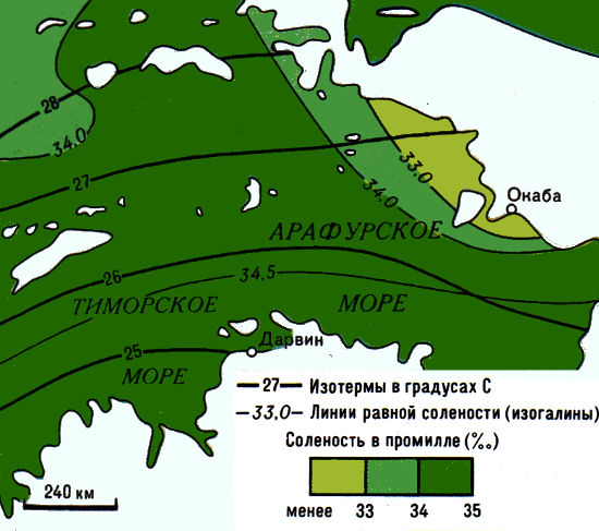 Соленость на поверхности Арафурского моря изменяется по вертикали и горизонтали неодинаково, что связано с перемещением вод, испарением, распределением речного стока и т.д.