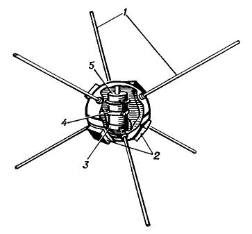 Искусственный спутник Земли «Авангард-1»: 1 — антенны; 2 — солнечные батареи; 3 — передатчик с электропитанием от солнечных батарей; 4 — химические батареи; 5 — передатчик с электропитанием от химических батарей