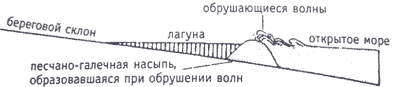 Вдольбереговой бар – гряда в прибрежной полосе морского дна, вытянутая вдоль общего направления берега и сложенная морскими наносами (песок, гравий, ракуша). Образуется на очень пологом мелком морском дне, когда волны разрушаются, не доходя до береговой линии. Пример такого побережья – мыс Хаттерас на Атлантическом побережье США.